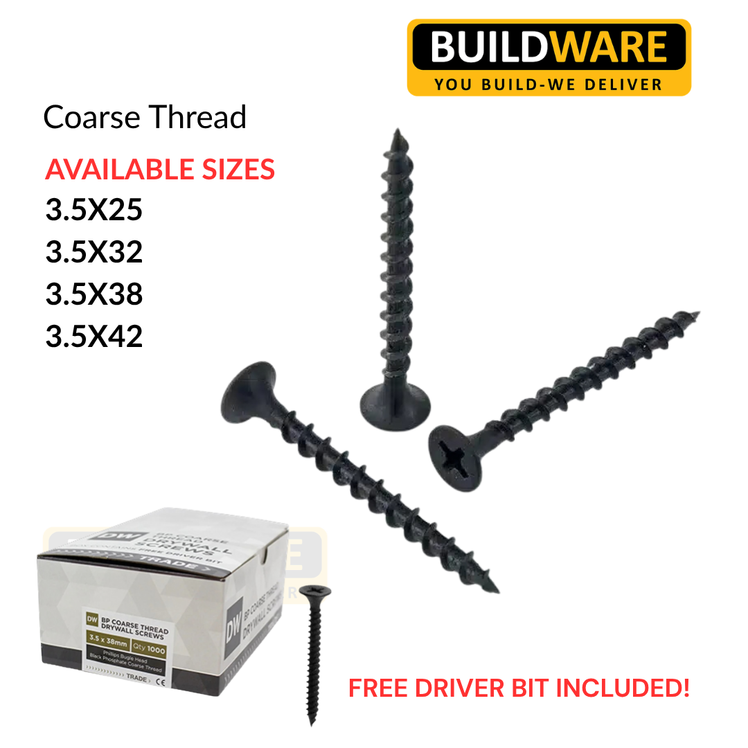 Coarse Thread Black Phosphate Drywall Screws (Box of 200) with Free Driver Bit are designed for fast, secure fixing of plasterboard to timber studwork. The coarse thread provides strong bite and rapid drive‑in performance, while the bugle head ensures smooth countersinking without damaging the board surface.