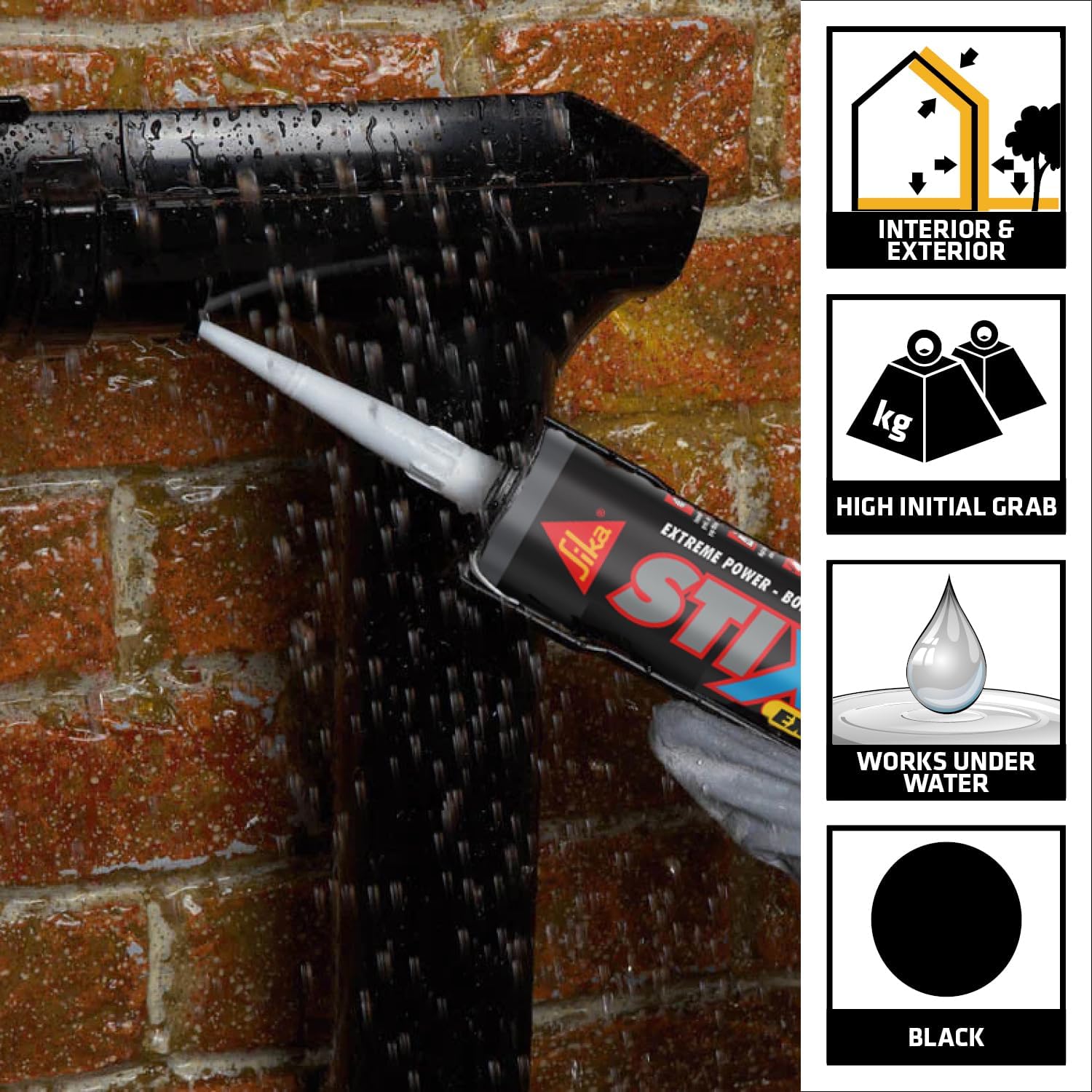 Sika Stixall Extreme Power is a high‑performance hybrid polymer adhesive and sealant designed for demanding construction, installation and repair tasks. Listings consistently highlight its extreme initial grab, zero‑sag formula, and gap‑filling strength, making it suitable for bonding and sealing a wide range of materials including wood, metal, brick, concrete, plastics, ceramics and more. It provides a durable, waterproof seal, allowing reliable use in both interior and exterior environments.